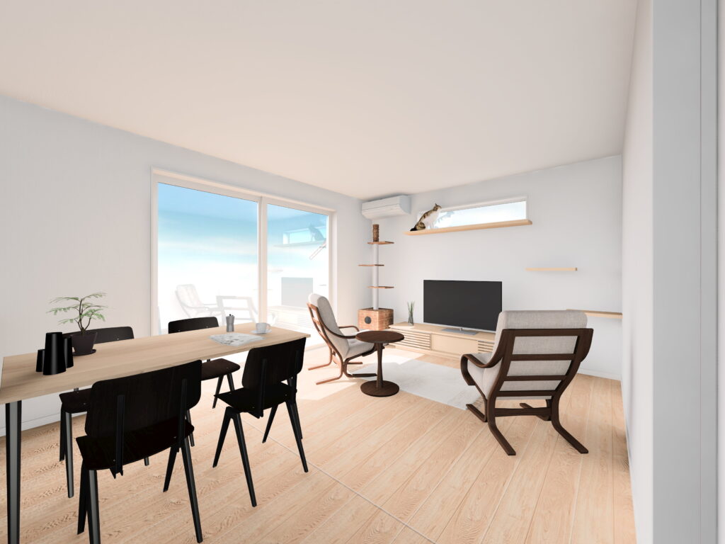 日当たりの良い南側LDKにキャットウォークやペットドアをつけて、猫ちゃんも人も